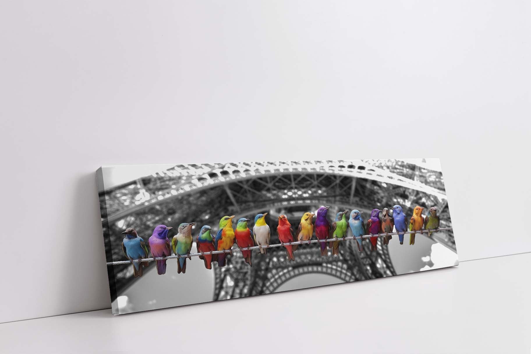 Birds in color set against the Eiffel Tower. Color on black and white. Love Birds in the city of love.Â